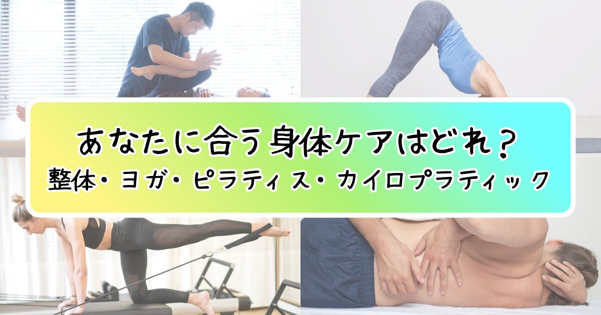 整体・ヨガ・ピラティス・カイロプラティックは、それぞれ目的や効果が異なります。肩こり・腰痛なら整体やカイロプラティック、柔軟性や心身の調整ならヨガ、姿勢改善や筋力アップならピラティスが向いています。まずは体験レッスンや施術で、自分に合った方法を試してみましょう。